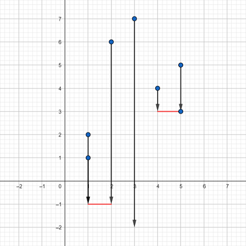 Cuando colocas ambas plataformas, todos los puntos comienzan a caer (disminuyen su \(y\)). Si un punto colisiona con alguna plataforma en algún momento, se detiene y se salva. Los puntos que nunca colisionan con ninguna plataforma se pierden.