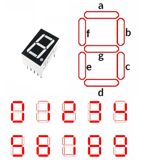 La XPOCET cada vez está más cerca, tus profesores te han pedido que participes con algún proyecto pero no sabes nada de nada, por lo que estás dispuesto a aprender, junto con tu amigo,a utilizar un display de 7 segmentos para aprender a mostrar números (y después hacer un proyecto con eso). Cada segmento tiene asignada una letra para que puedas prender ese segmento y así sea posible generar números. A continuación se muestra cada uno de los segmentos y los números que pueden formarse:
